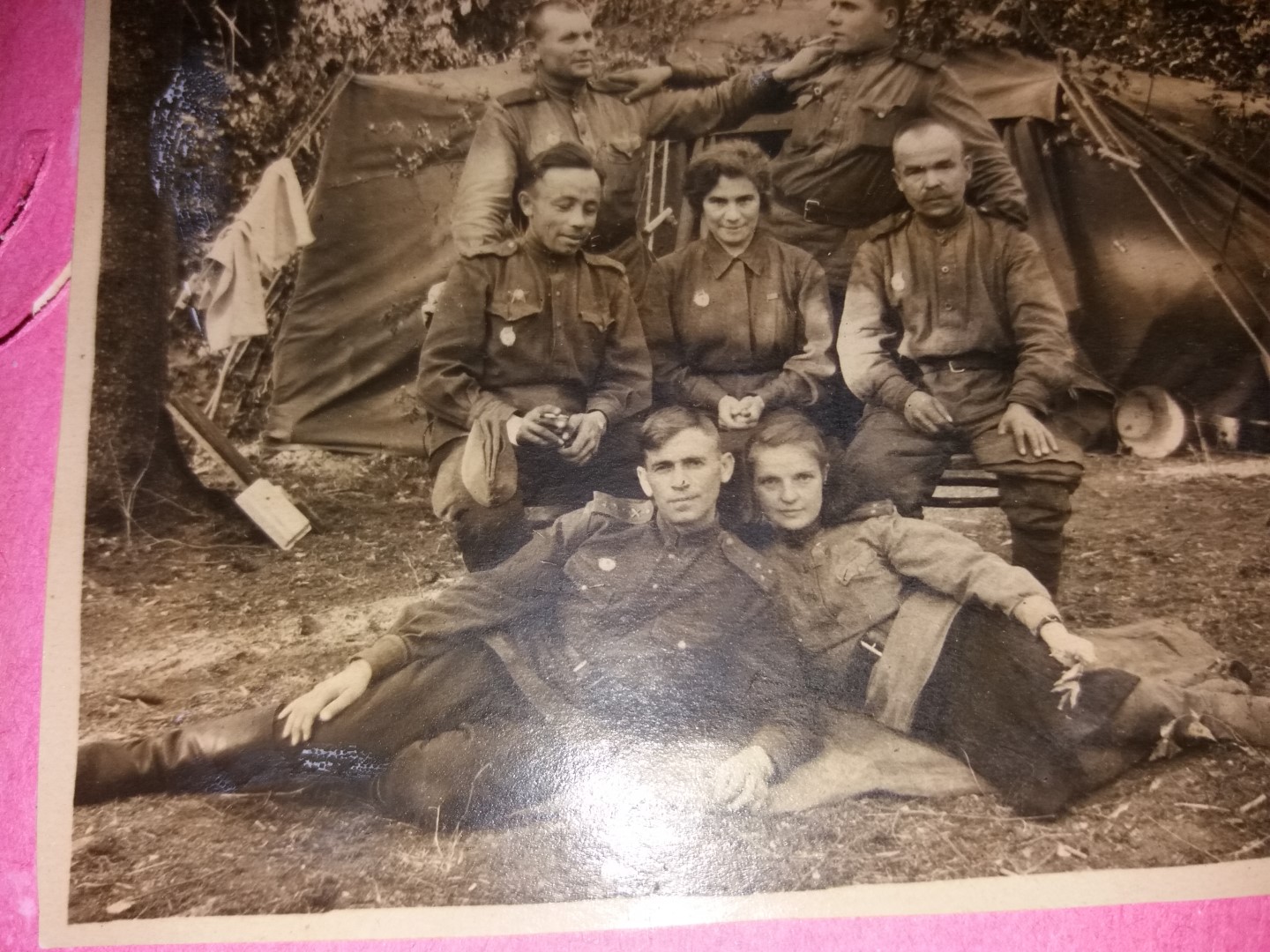 На переднем плане на плащ-палатке - папа и мама.